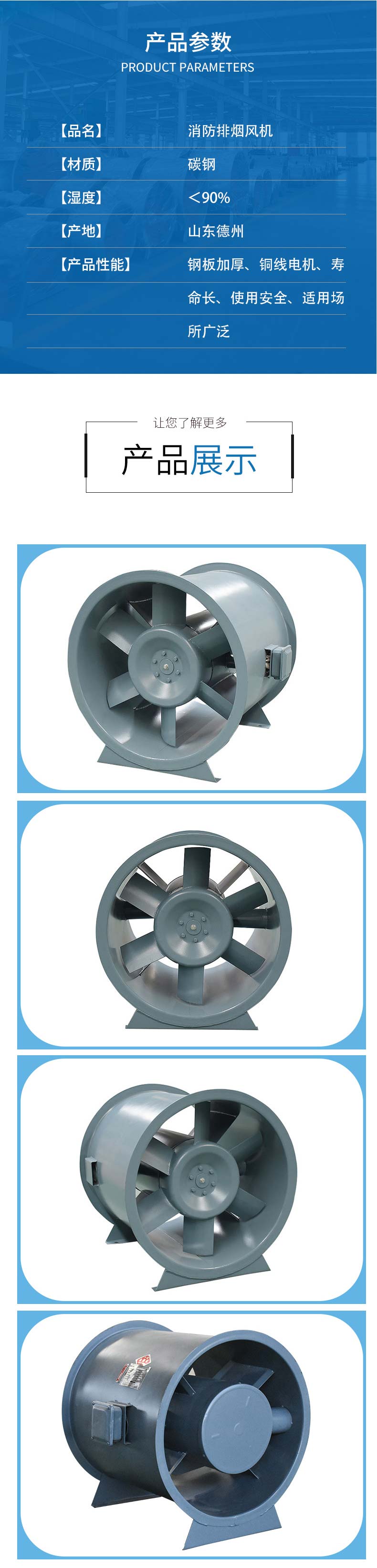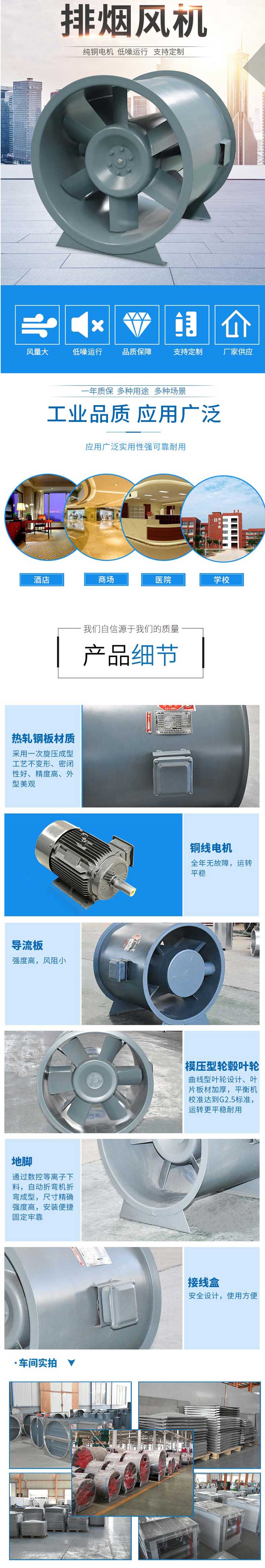 消防高溫排煙風機具有耐高溫性能優、效率高、安裝方便、運行可靠(可生產單速、雙速、屋頂式及防爆型)等特點,可直接與風管連接和墻壁安裝(安裝形式可垂直式、水平式或吊裝式),適用于高層民用建筑、烘箱、隧箱、地下車庫和特種工礦企業等。